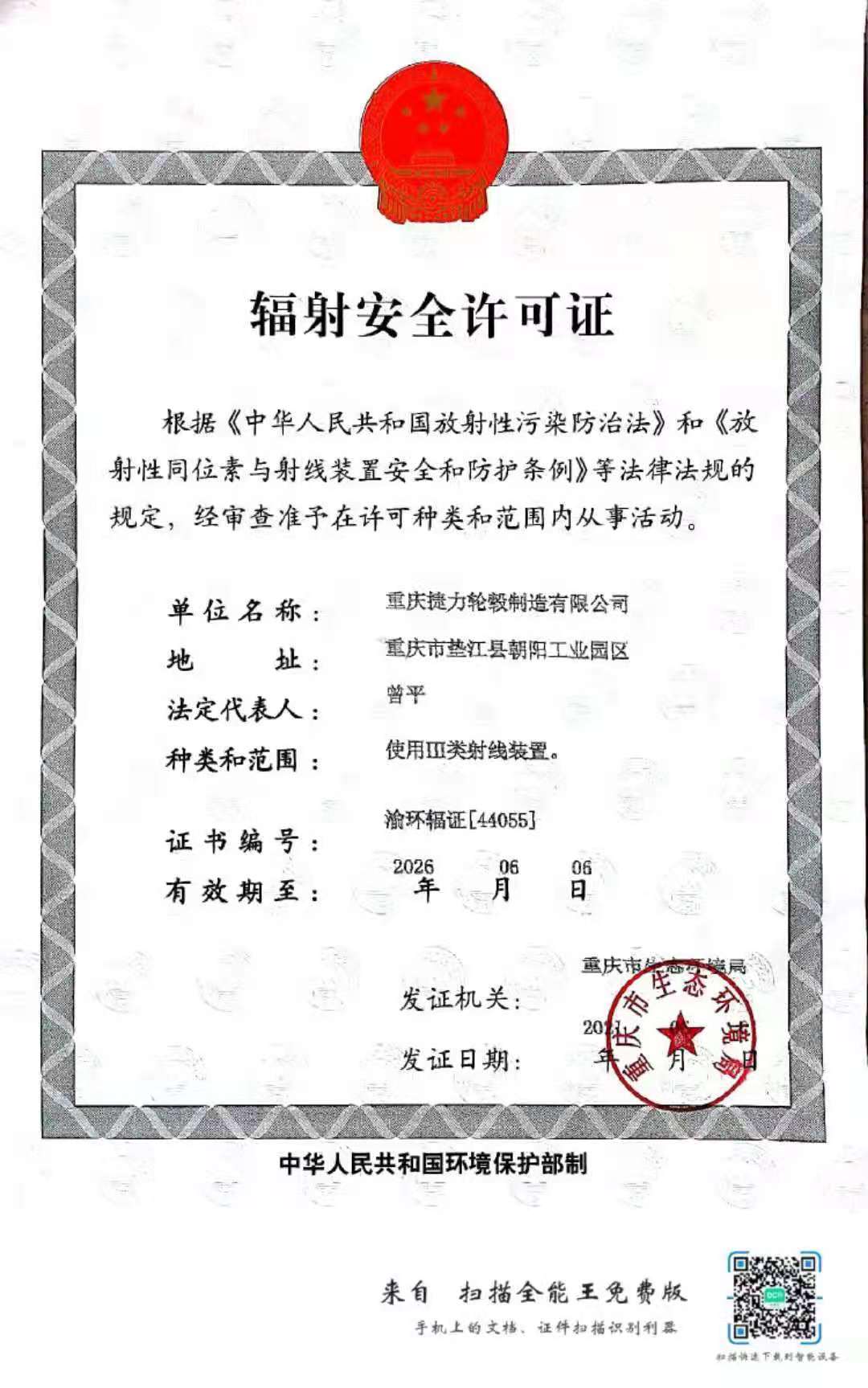 2015年,投建X射線探傷室,并取得輻射安全許可證。2015年建立環(huán)境管理體系認證:通GB/T24001-2016/ISO 14001:2015標準, 2018年通過了環(huán)境管理體系換證審核。